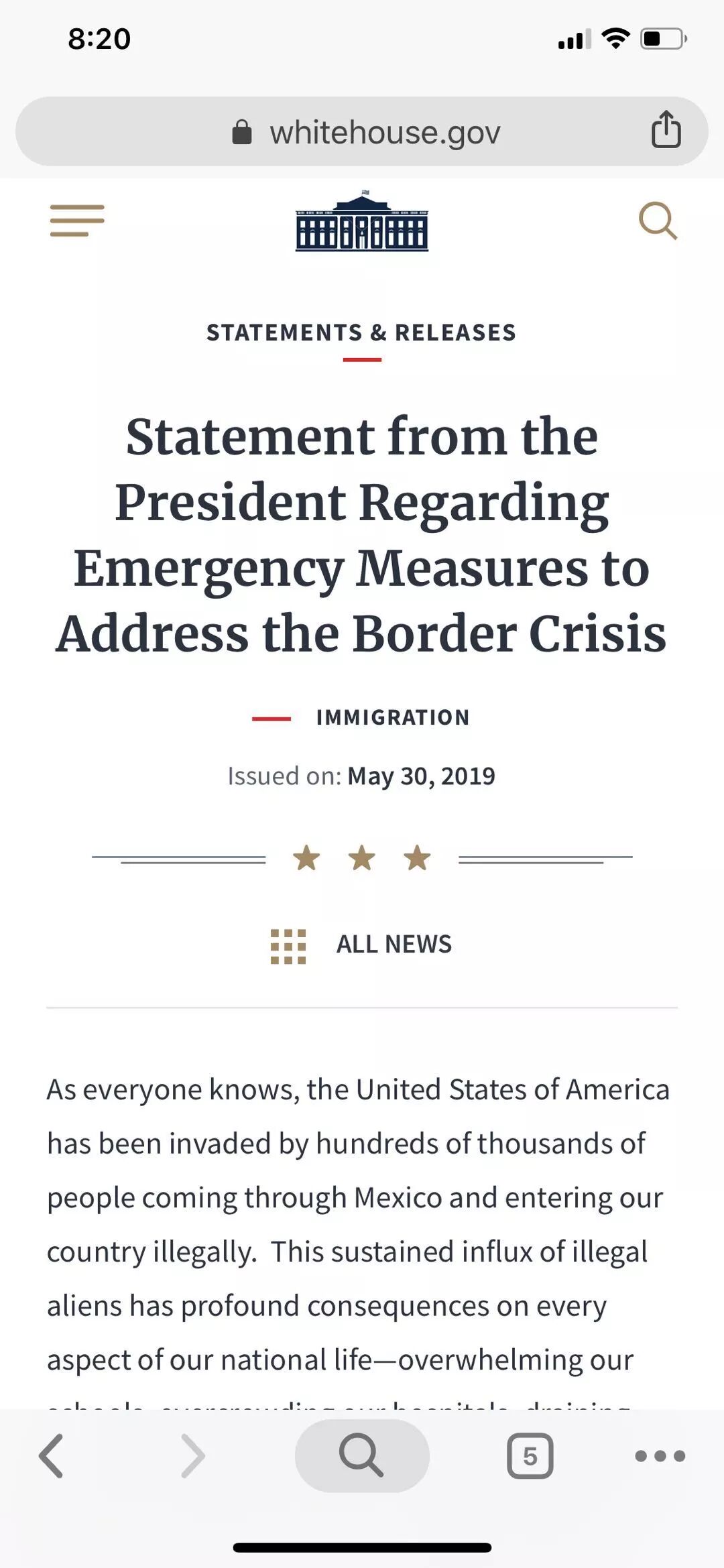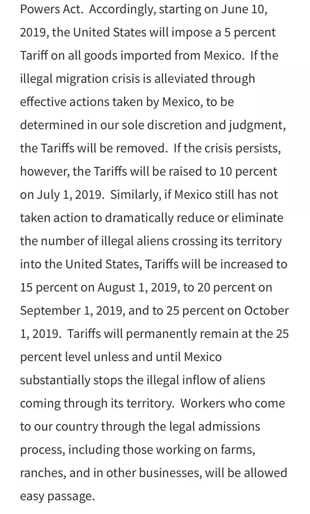 特朗普在声明中称,自6月10日起对进口自墨西哥的所有商品征收5%的关税。他还威胁称,税率会从7月1日起逐月上调,“如果危机持续,到10月1日对墨西哥的关税税率将上调至25%,并保持这一水平,直到非法移民问题得到解决。”他称,白宫稍后将公布更多细节。