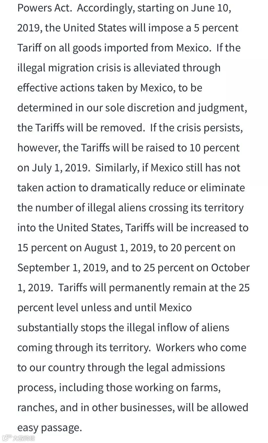 从6月10日起美国将对所有墨西哥输美商品加征5%的关税,因为墨西哥没能挡住非法移民从南部边境进入美国,如果问题不解决关税还将逐步增加。7月1日增加到10%,8月1日增加到15%,9月1日增加到20%,10月1日增加到25%。如果问题一直得不到解决,关税将保持在25%的水平上。
