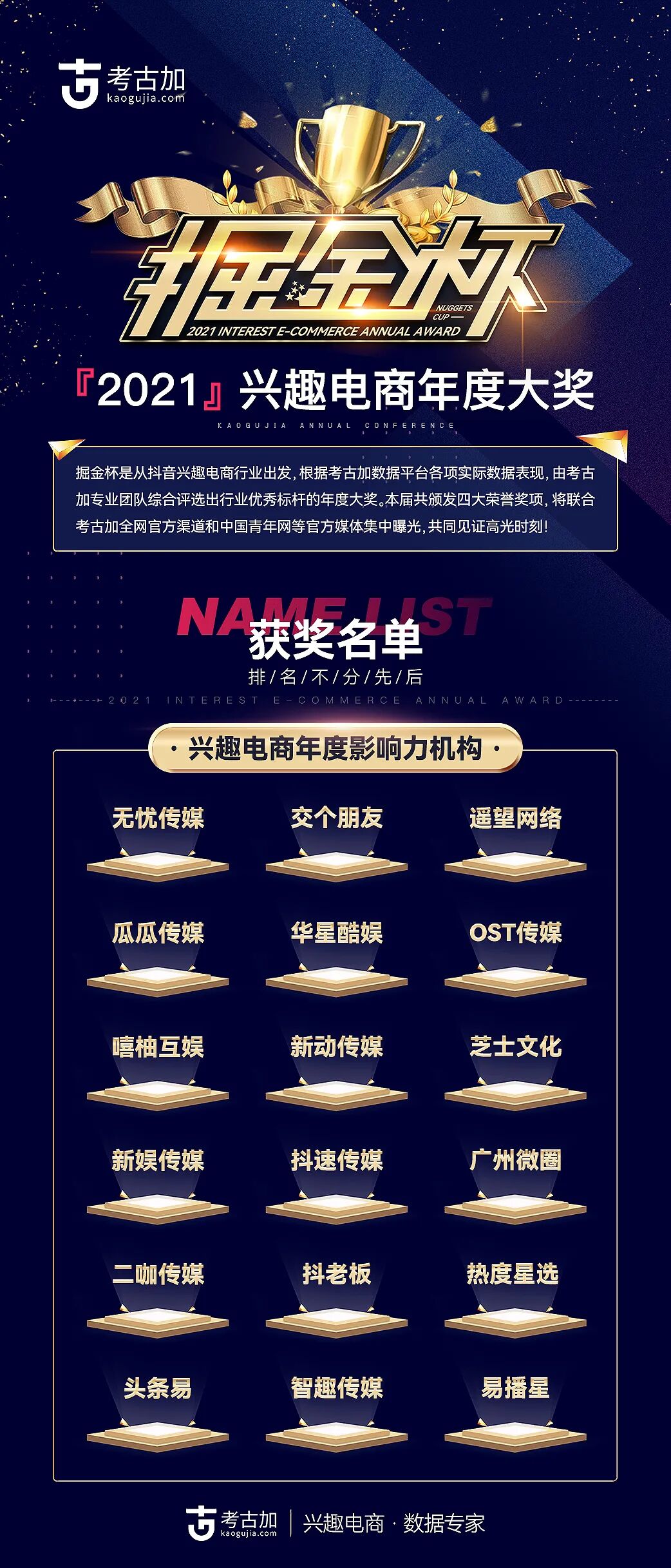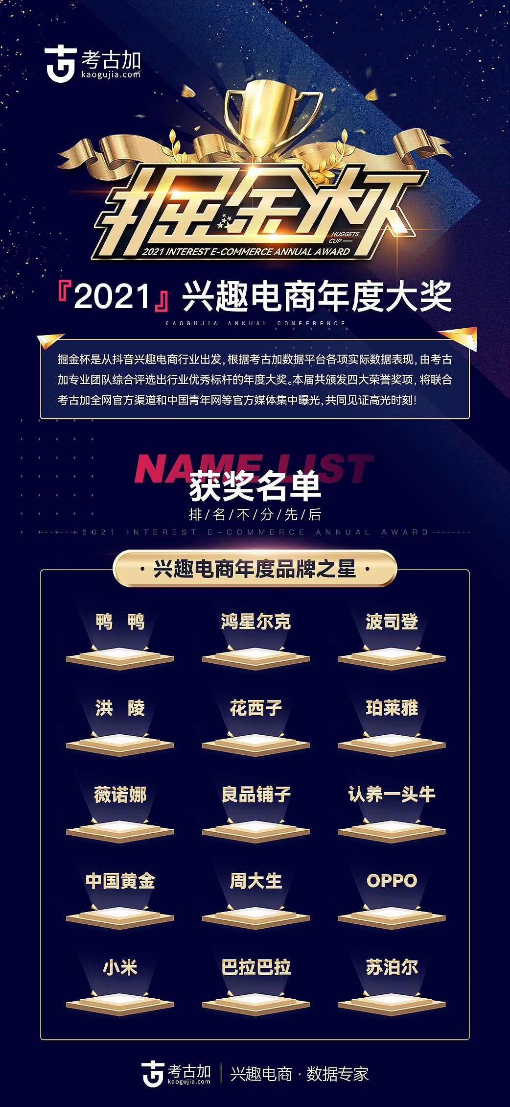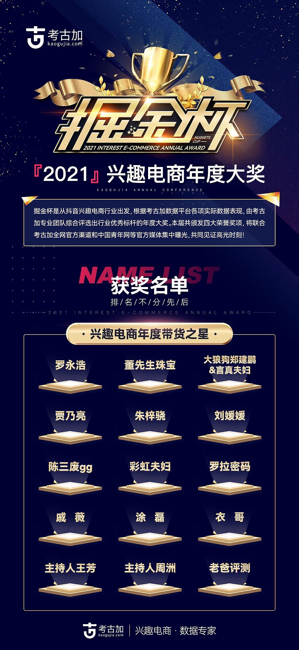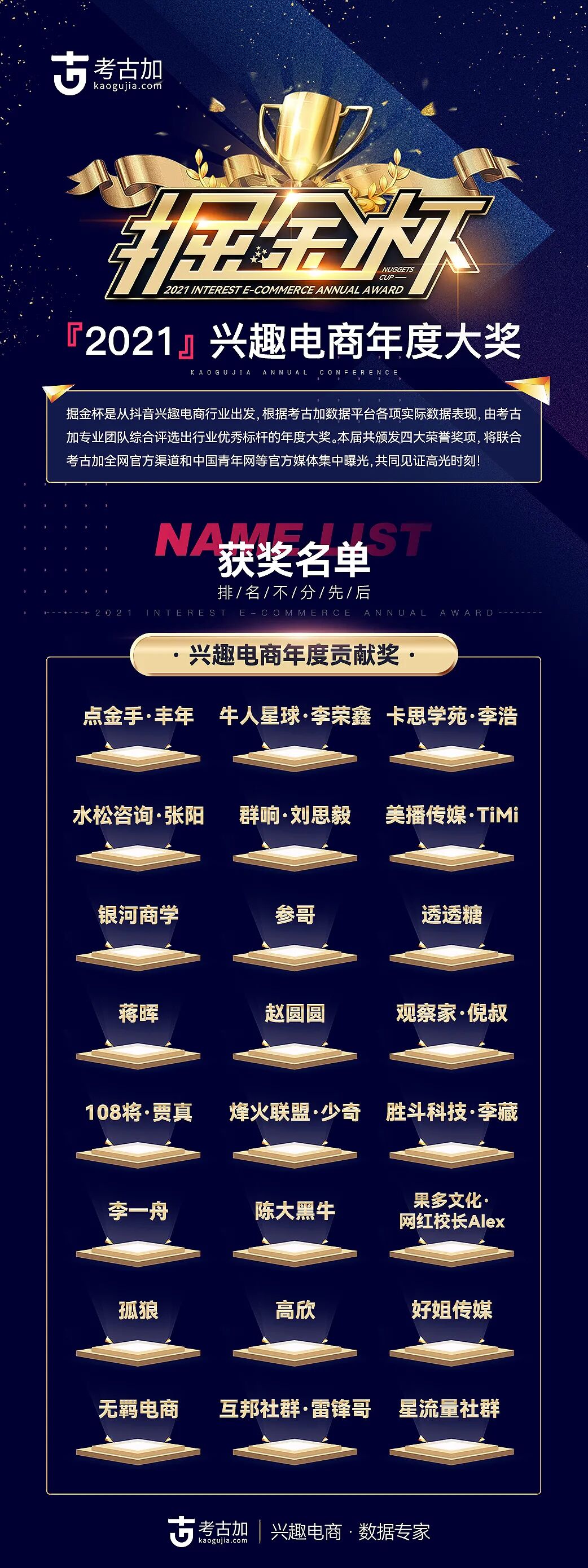 与此同时,考古加倾力打造兴趣电商首个“掘金杯”年度大奖,颁出「兴趣电商年度带货之星」、「兴趣电商年度品牌之星」、「兴趣电商年度影响力机构」、「兴趣电商年度贡献奖」4 大奖项。