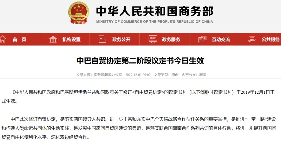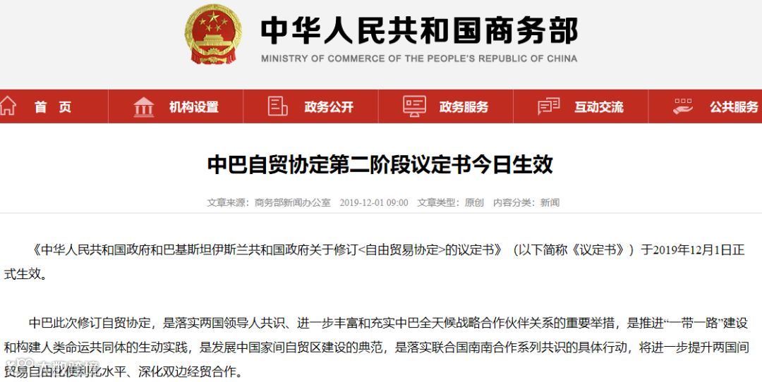 商务部网站12月1日消息,《中华人民共和国政府和巴基斯坦伊斯兰共和国政府关于修订<自由贸易协定>的议定书》(以下简称《议定书》)于2019年12月1日正式生效。