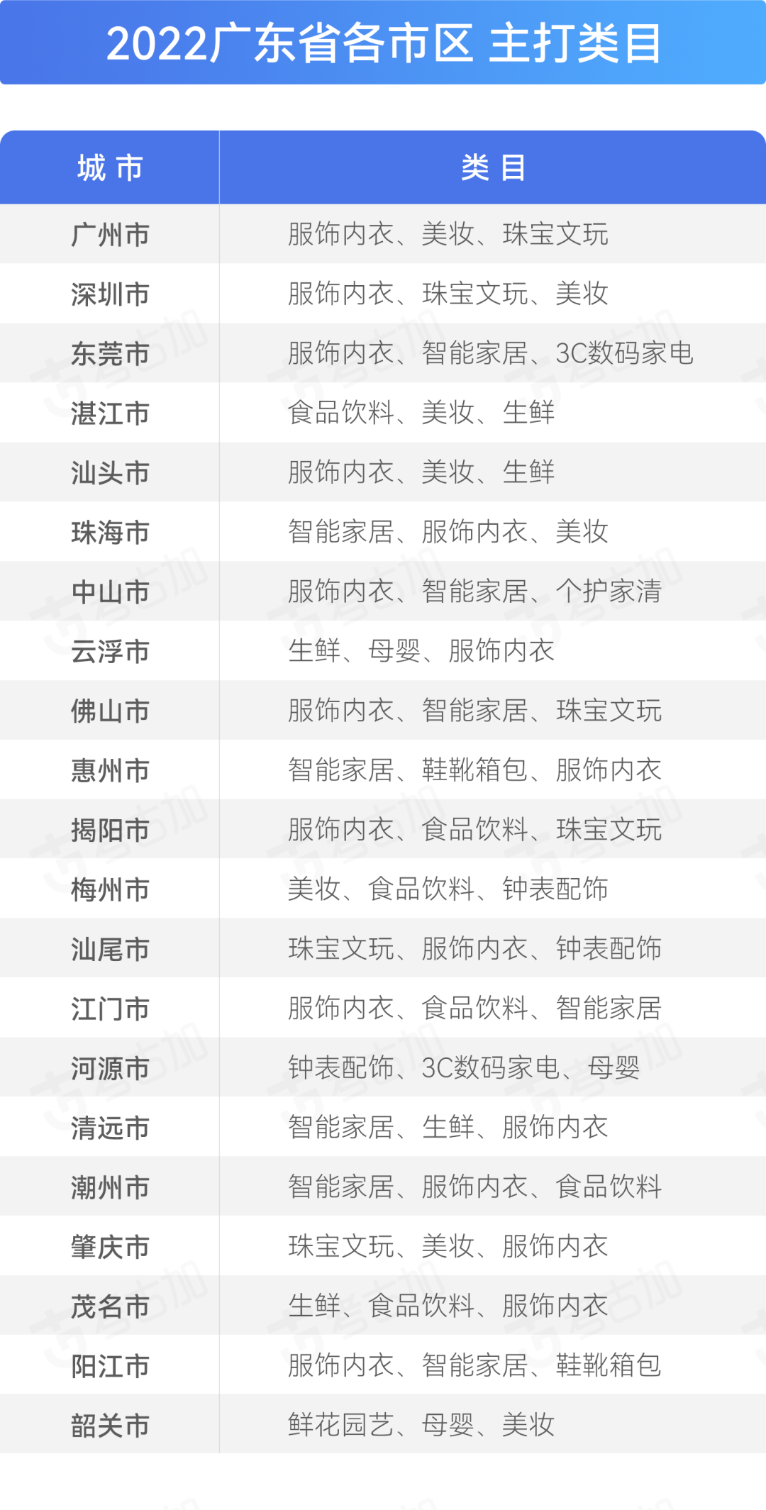 从主打品类维度看,服饰内衣占据榜首,包揽近1/2市场份额。从地域分布维度看,几个城市主打的品类也不尽相同,详见下表。