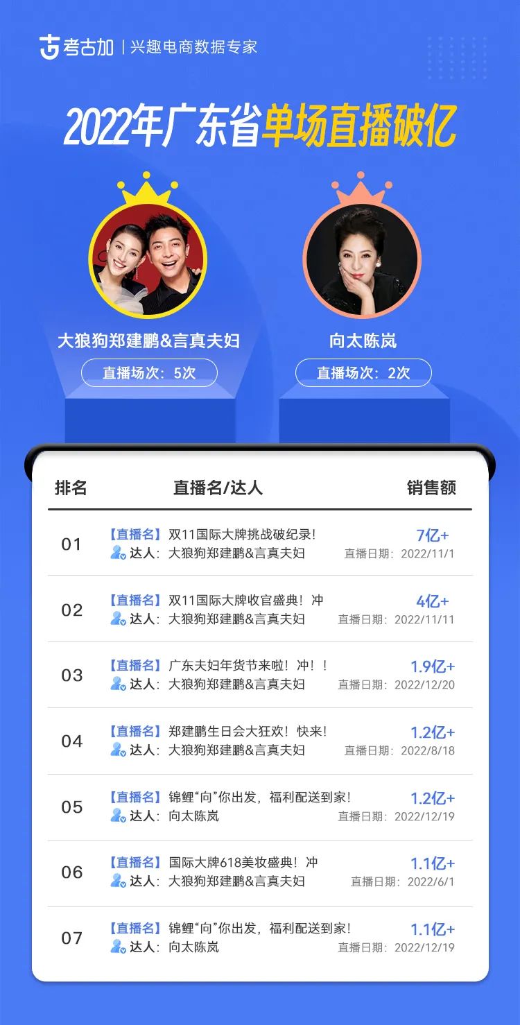直播单场GMV过亿是众多达人的梦。2022年,广东省有两位达人做到了!@向太陈岚 2次直播单场GMV过亿,而@大狼狗郑建鹏&言真夫妇 ,5次直播单场过亿。