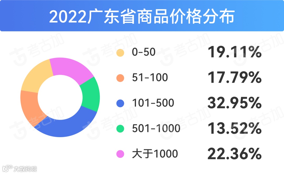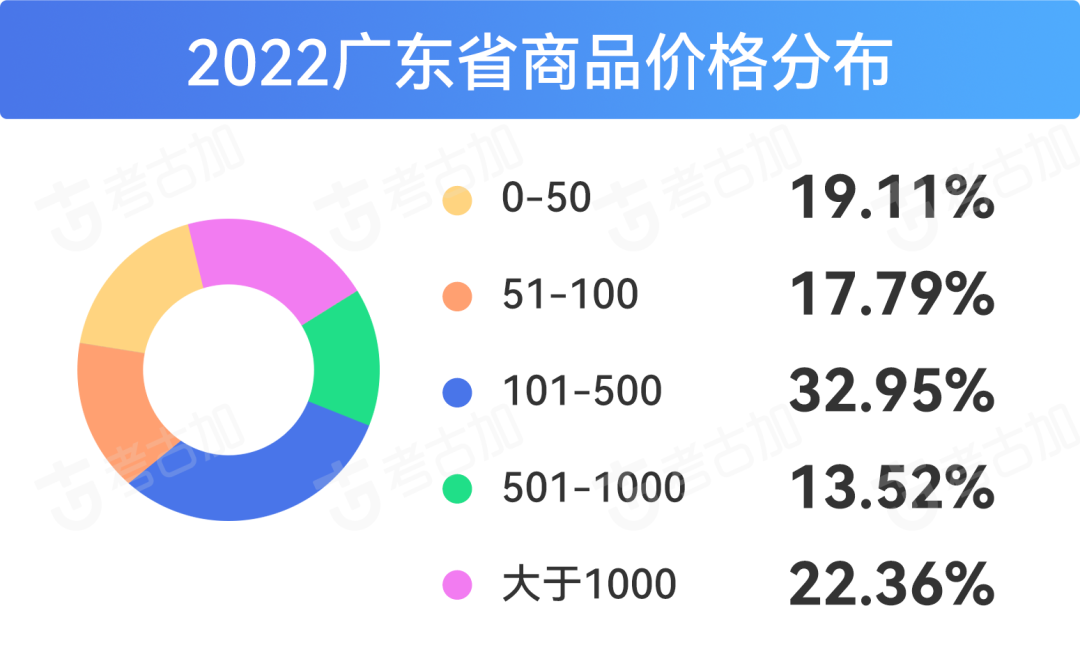 据考古加数据统计:2022年抖音电商广东省总销售额占全国的17.5%,客单价81.58元,商品链接数1400万+,小店数4万+,达人数110万+。