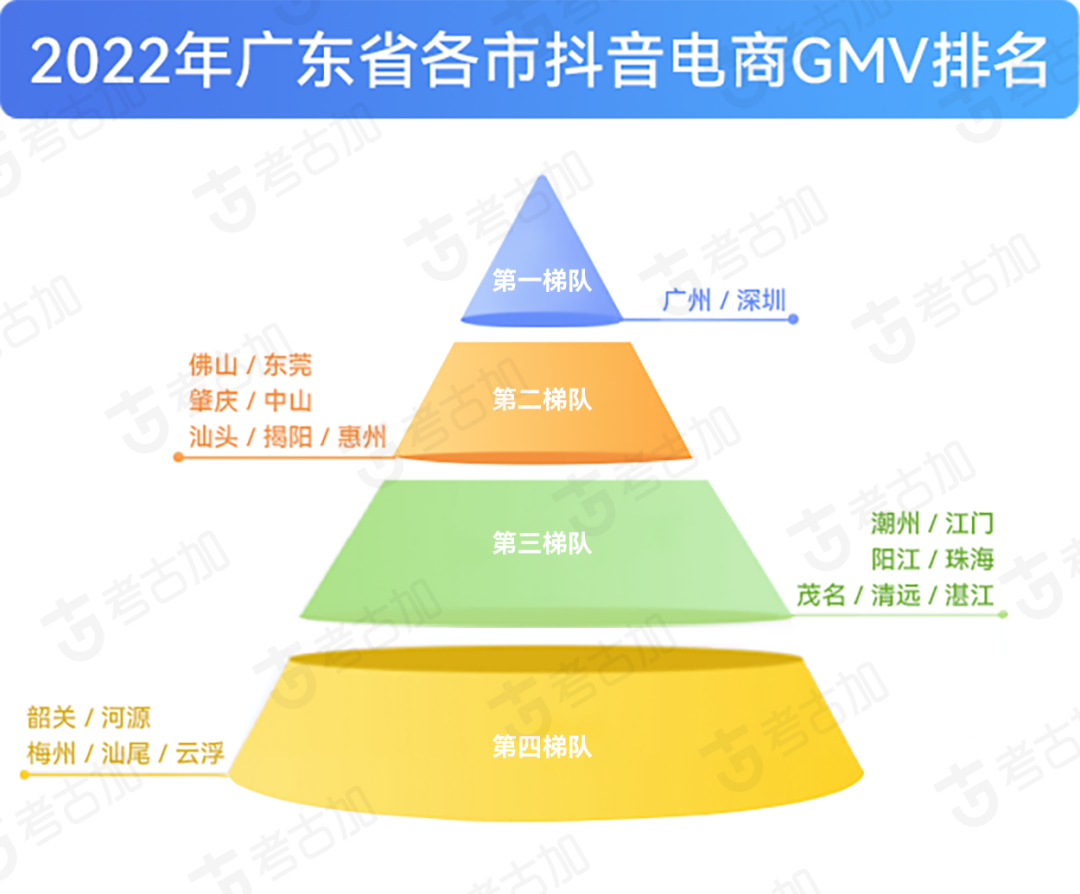 通过统计2022年广东省各区市销售额排名,我们根据GMV排名将各市划分为五个梯队。