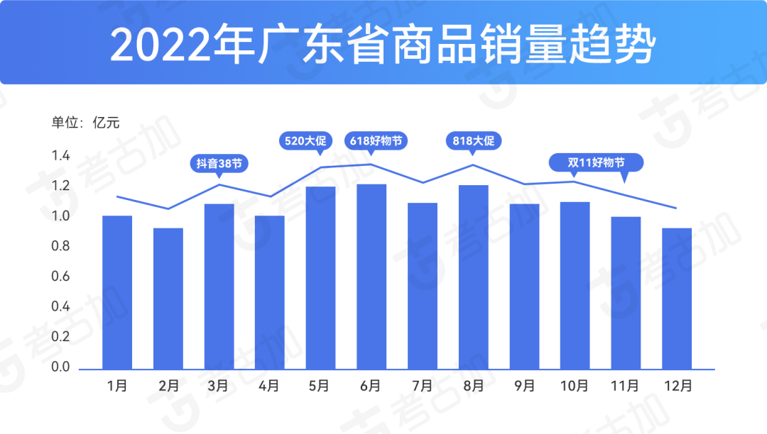 回顾2022年,抖音电商举办的38大促、520大促、618好物节、818大促、双11好物节等节点营销让更多好物被看见,广东省商品销量也在3月、5月、6月、8月、10月、11月出现明显峰值。