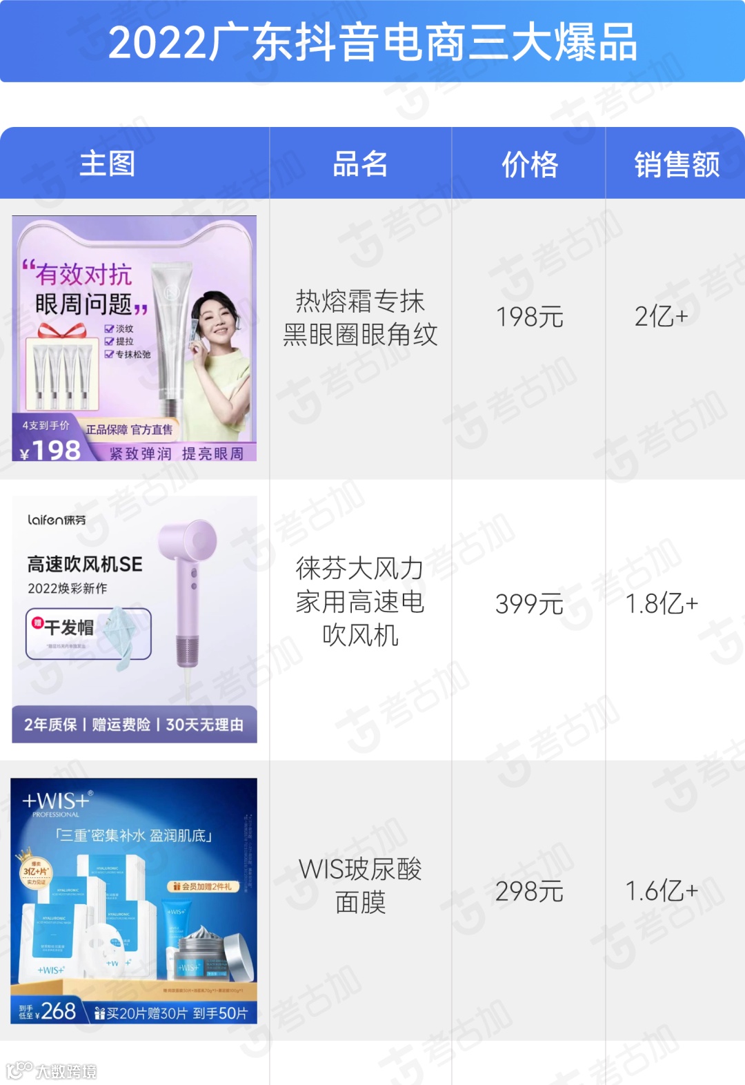 2022年广东省商品销售额排行TOP3的爆品为:热熔霜专抹黑眼圈眼角纹、徕芬大风力家用高速电吹风机、WIS玻尿酸面膜。