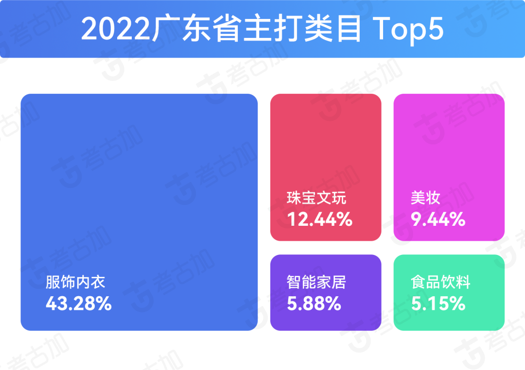 广东省主打品类与抖音电商大盘整体趋势基本一致,TOP5分别为:服饰内衣、美妆、珠宝文玩、智能家居、食品饮料。