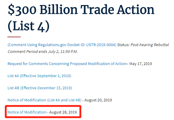 刚刚,美国当地时间2019年8月28日,美国贸易代表办公室官网发布通知,确认针对中国输美3000亿美元产品(LIst 4清单)关税税率由原定的10%提高至15%,按两个批次执行,对3000亿美元加征关税产品分为A、B两个清单,“List 4A”清单中的产品将于美国东部时间9月1日开始正式征收15%的关税,“List 4B”的清单中的产品将于美国东部时间12月15日开始正式征收15%的关税。
