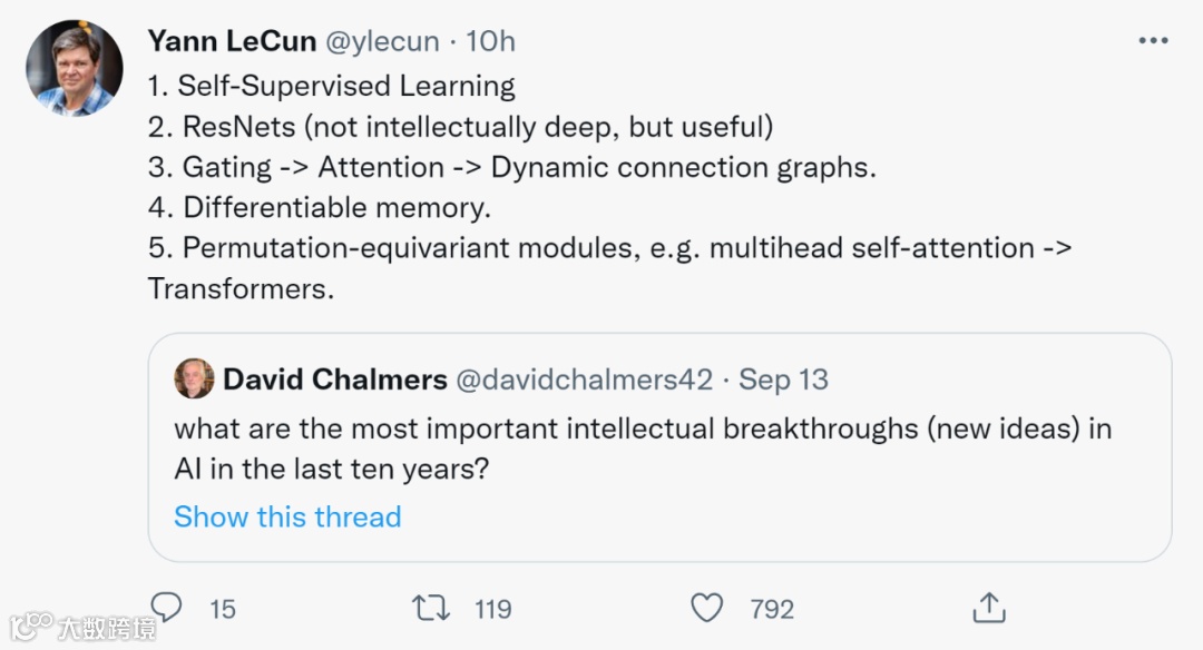 在LeCun看来,过去十年最重要的成果包括自监督学习、ResNets、门-注意力-动态连接图、可微存储和置换等变模块,例如多头自注意力-Transformer。
