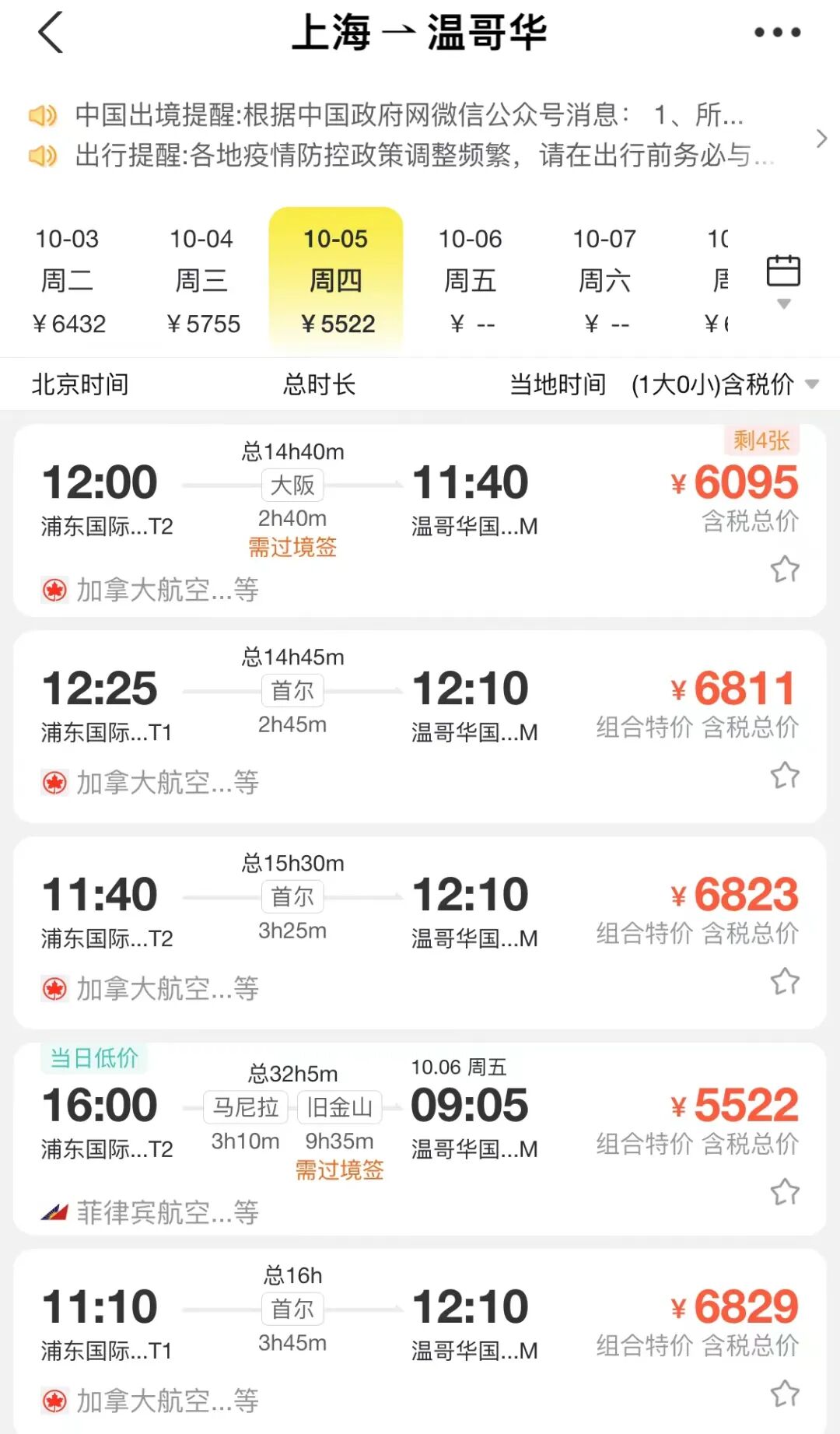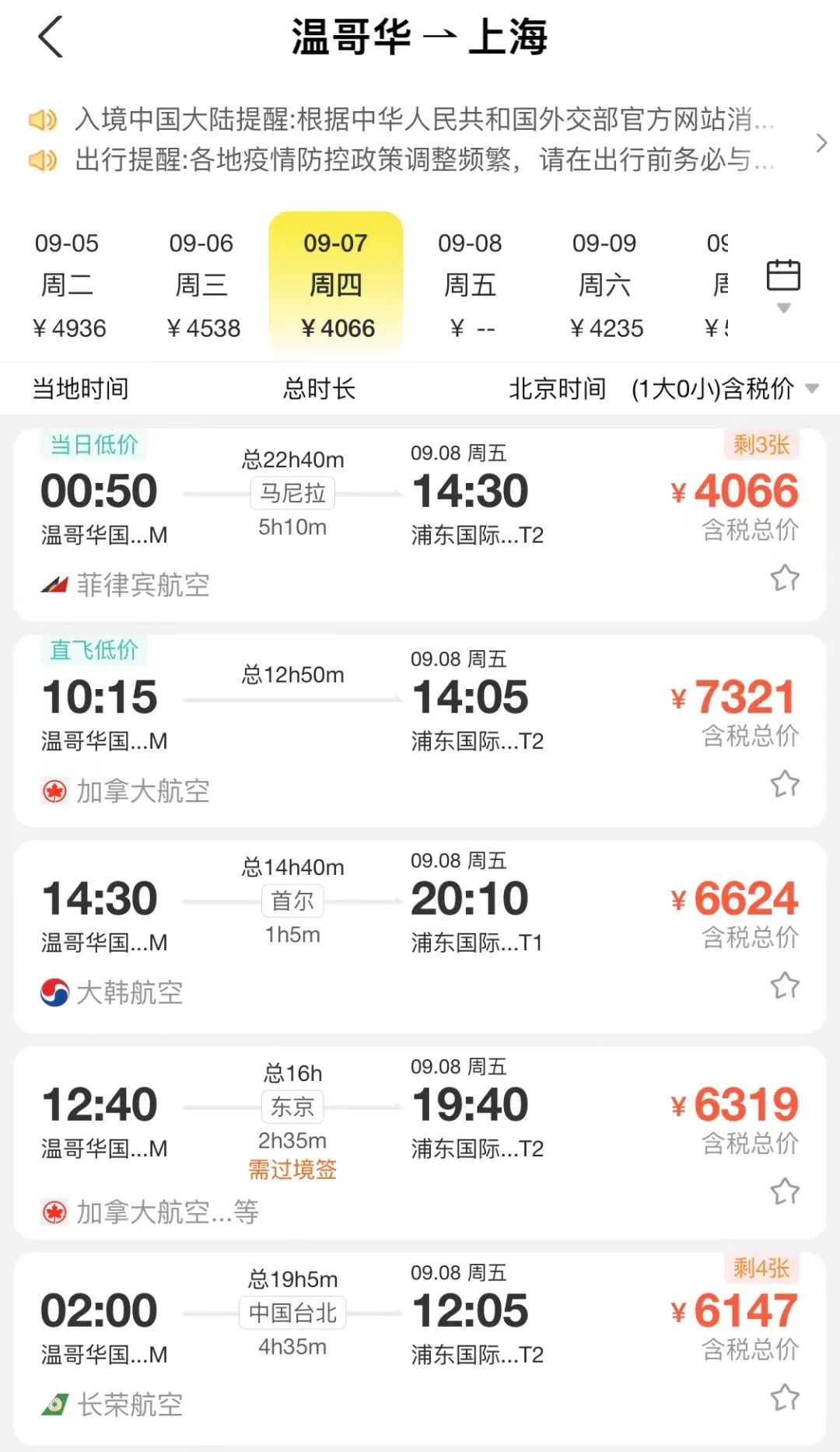 除此以外,最近的机票价格也是相当令人动心,9月7日温哥华飞上海的票价最低不过四千出头,而且当天加航直飞的机票价格也就七千多。