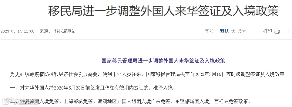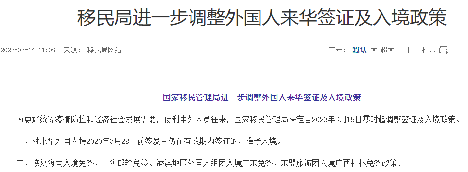 为更好统筹疫情防控和经济社会发展需要,便利中外人员往来,国家移民管理局决定自2023年3月15日零时起调整签证及入境政策。