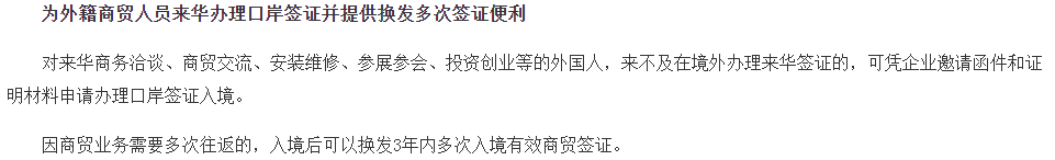 2. 为外籍商贸人员来华办理口岸签证并提供换发多次签证便利。