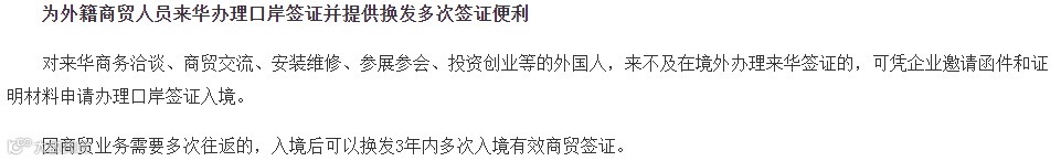 为顺应商贸规则,助力国内外向型企业“引起来”,公安部、国家移民管理局决定为外籍商贸人员提供口岸签证和多次签证便利。
