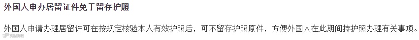外国人申请办理居留许可在按规定核验本人有效护照后,可不留存护照原件,方便外国人在此期间持护照办理有关事项。