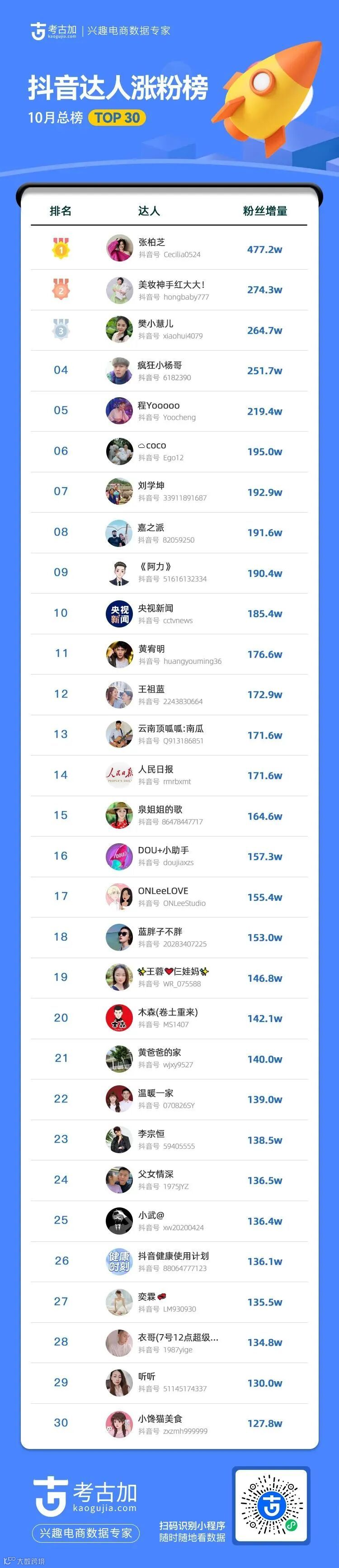 涨粉第一名是明星账号@张柏芝 ,10月共涨粉477.2万,目前粉丝总量2816.5万。张柏芝于在10月13日在抖音平台开启直播带货首秀,开播仅10分钟直播间观看人数就突破了100万,开播当晚最高人气峰值83.3万。