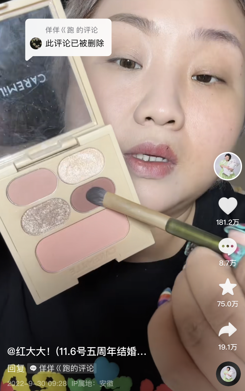 据悉,该达人走红是因为其在9月30日发布的一条眼影教程视频,此前有网友对其所发布的画眼影方法和专业度表示质疑,该达人特意发布了一条眼影教程进行回应。不过,目前该网友的评论已经删除。