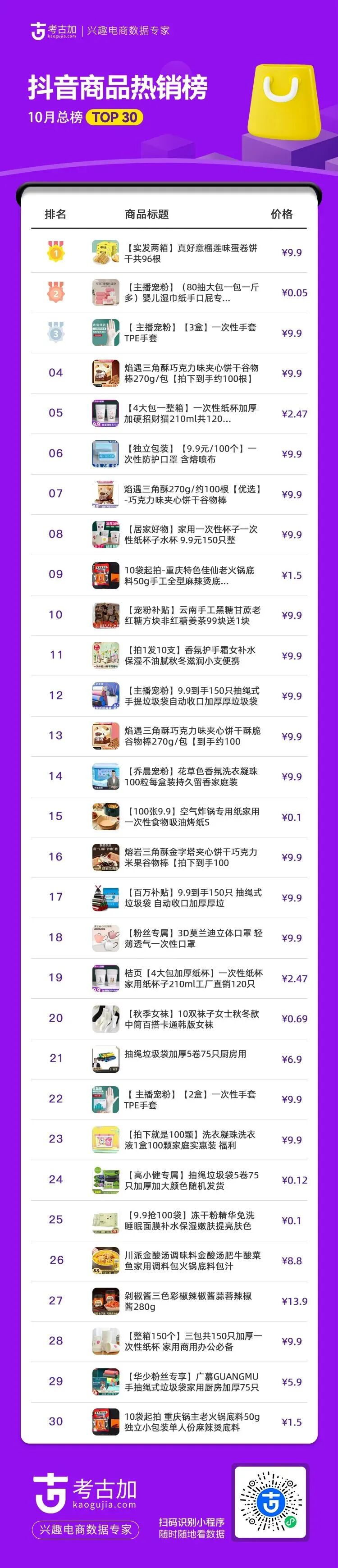 为此,我们统计了10月1日-10月31日期间抖音相关数据,推出直播带货、爆品、涨粉三大榜单。为您详细解析10月抖音趋势,提供数据参考。