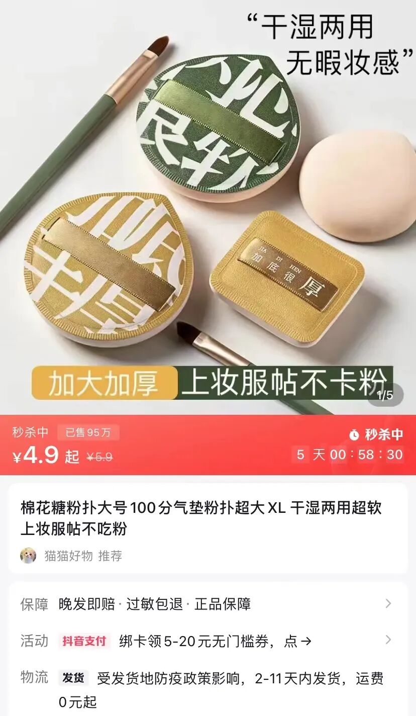 销量排名第五的棉花糖粉扑也很适合视频种草,小小一个方便携带,视频里展示的清透服帖的底妆十分吸引人,4.9元的价格不需要考虑就能购买,再加上化妆师安利的标签,很容易就会被种草。