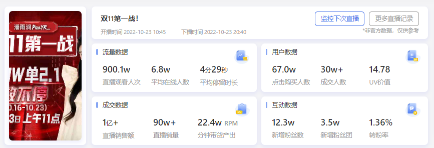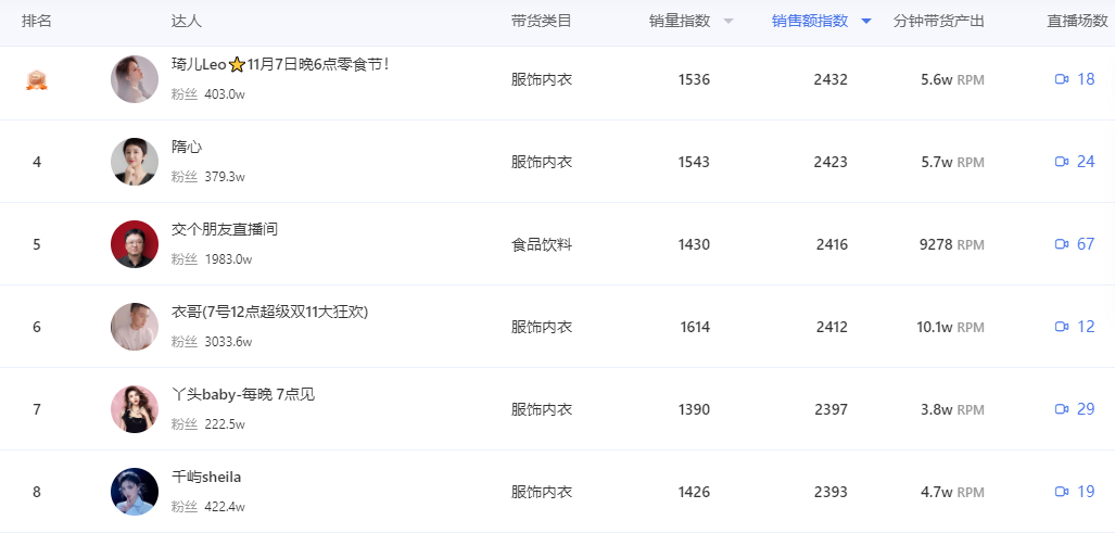 带货方面:服饰内衣赛道表现亮眼,双十一好物节预售加持下,引爆了用户的消费热情,各大主播销售数据迎新高峰;