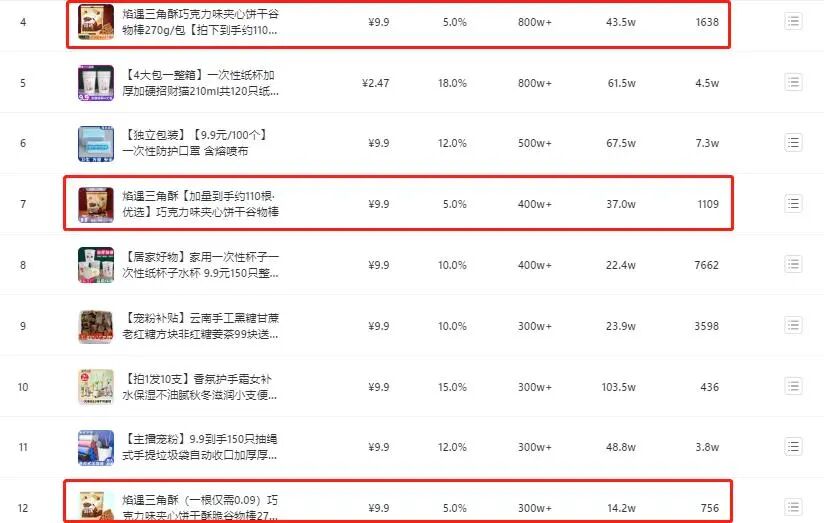 10月直播热销榜中出现多款“巧克力夹心三角酥”,成为本月热门商品。其中销量最高的是“造恋”小店上架的这款“巧克力夹心三角酥”,商品销量超800万。