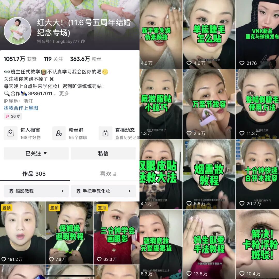 第二名是新入围的美妆账号@红大大! ,10月涨粉274.3万,目前粉丝总量362万。考古加数据显示,该达人在10月共发布了57个作品,平均点赞7.2万。