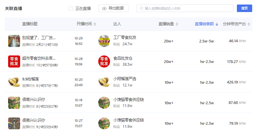 产品近30天关联的直播场次为1.8万场,关联达人数3564位,多出现在零食工厂批发类的直播间里。带货的视频则以好吃、划算、网红零食等特性吸引用户下单。
