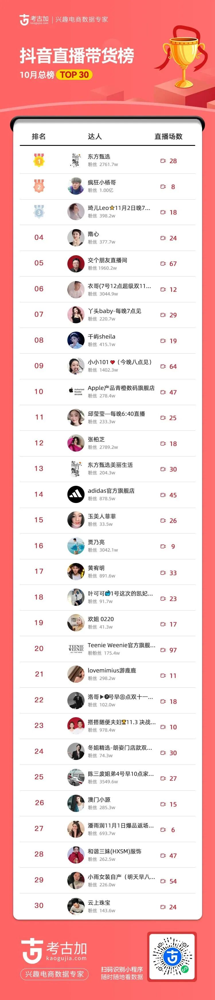 榜单前三的主播较上月没有太大的变化,@东方甄选 蝉联月冠,10月直播间销售额7亿+;榜二依旧由粉丝刚刚破亿的@疯狂小杨哥 摘得,10月直播间销售额预估4亿+,场均销售额5000万+;榜单第三名@绮儿Leo 10月共直播18场,销售额3亿+,实力同样不可小觑。
