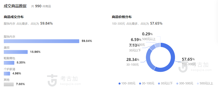 据考古加数据显示,该账号的粉丝画像以24-30岁的女性居多,选品以服饰内衣、美妆、鞋靴箱包为主,商品价格在100-300元的占比最多,占比为57.65%。