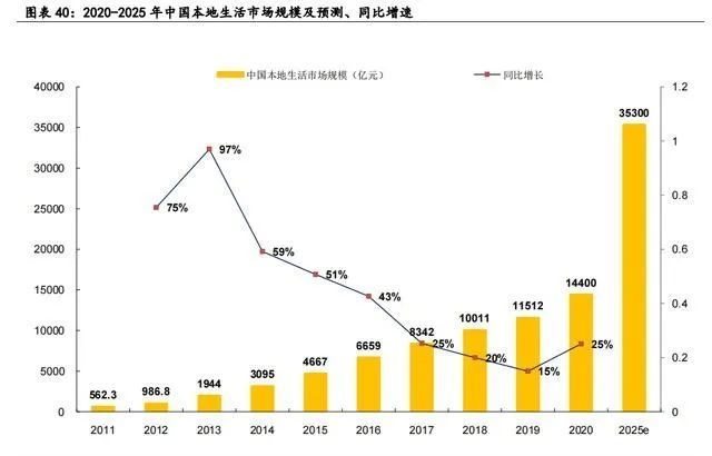 疫情的爆发,使得消费者对线上生活服务的需求激增。据艾瑞咨询数据,2020年中国本地生活服务市场规模为19.5万亿元,到2025年这一数字将会增长为35.3万亿元。