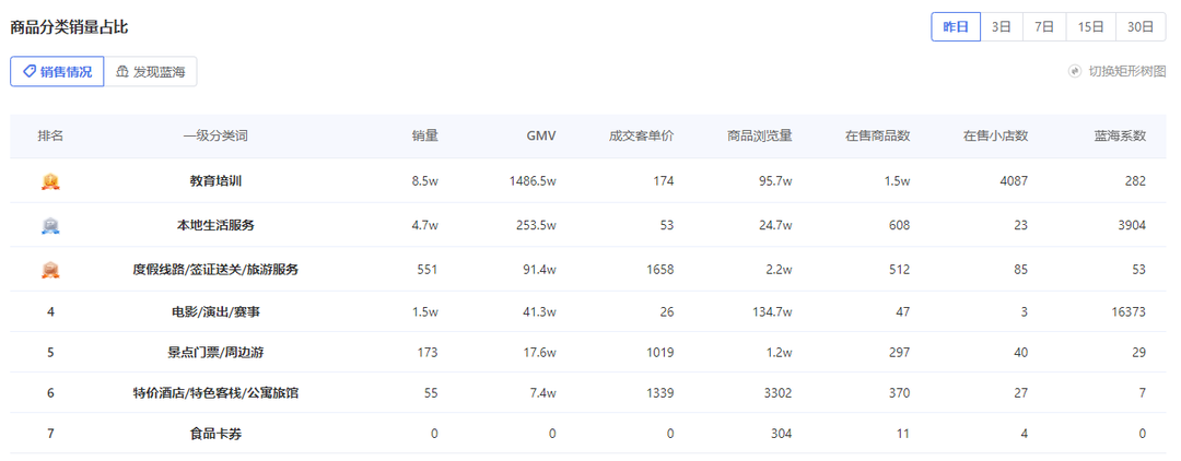 据考古加数据显示,本地生活赛道中:教育培训、零食卡券、旅游服务销售额占比最高。