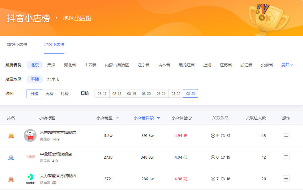 还可以查看自己所在省份的【抖音小店榜单】,了解最热小店动态与趋势。