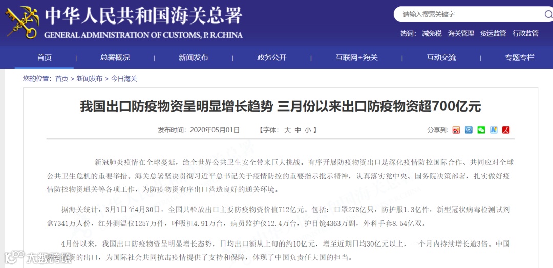 海关总署今天(1日)公布,3月1日至4月30日,全国共验放出口主要防疫物资价值712亿元。包括:口罩278亿只,防护服1.3亿件,新型冠状病毒检测试剂盒7341万人份,红外测温仪1257万件,呼吸机4.91万台,病员监护仪12.4万台,护目镜4363万副,外科手套8.54亿双。