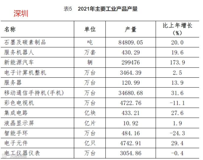 可以看到,深圳的主要工业品就是消费电子,例如智能手机、智能手环、液晶显示屏、电子元件、电工仪器表等,此外还有集成电路、新能源汽车、服务机器人等。