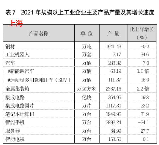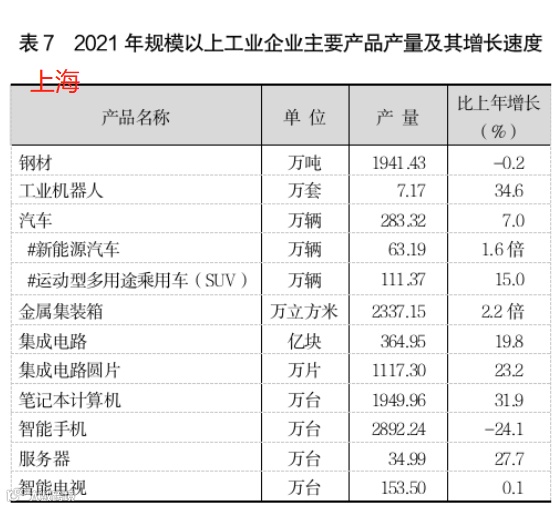 由此可见,上海的制造业还是比较高端的,主要包括集成电路、智能手机、智能电视、新能源汽车、工业机器人等,增长最好的是金属集装箱、新能源汽车,产量下滑最多的是手机。