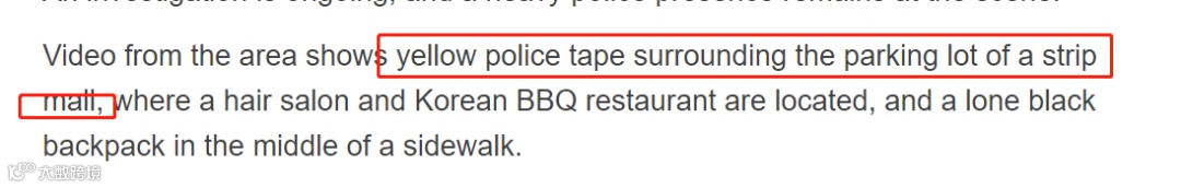 这个案发现场附近,还有一个购物中心,停车场被警方的黄色警戒线封锁。这里有一家发廊和韩国烧烤餐厅,人行道的中间掉落了一个黑色背包,疑与案件有关。