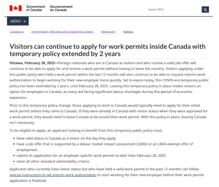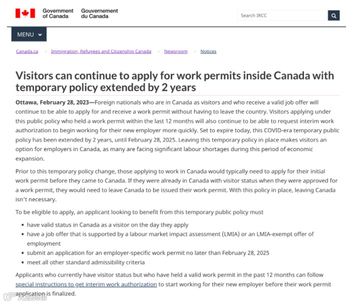 加拿大移民局在一个月前也宣布,旅游签转工签政策又延期到2025年2月28日!