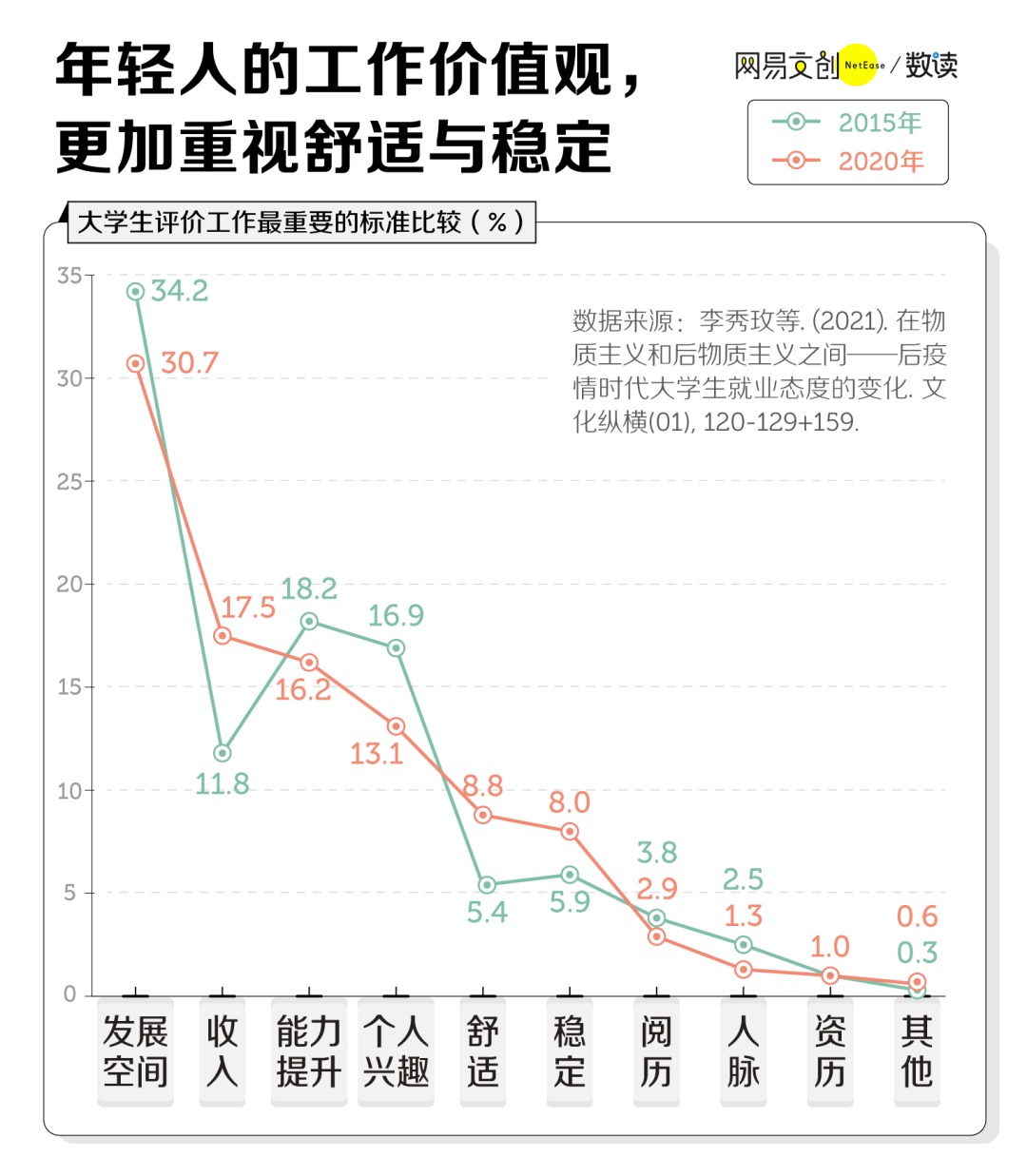 大学生认为收入最重要的比例从 2015 年的 11.8% 上升到了 2020 年的 17.5%,认为舒适和稳定最重要的比例也上升了 3 个百分点左右。