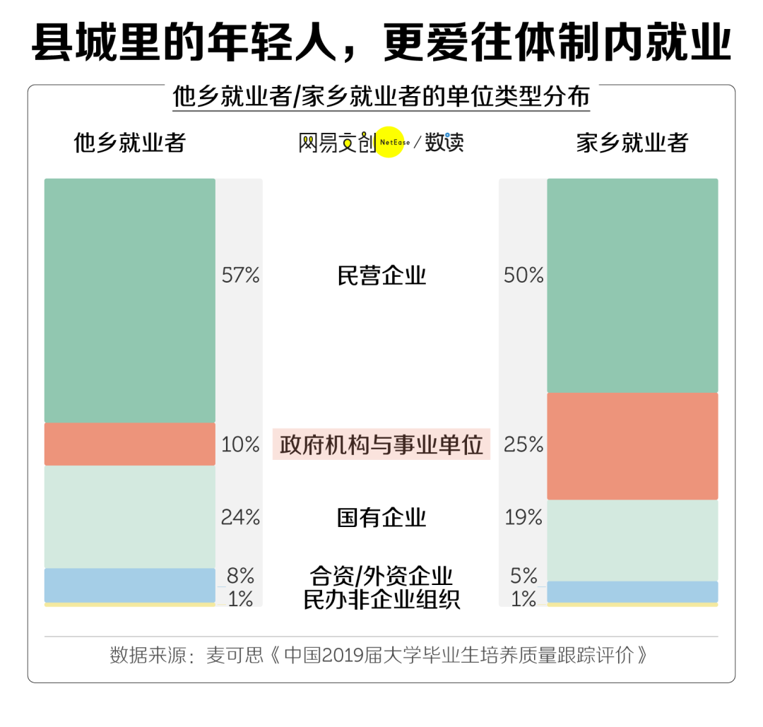 麦可思对 2019 届大学毕业生的调查显示,家乡就业者入职政府机构与事业单位的比例为 25%,比他乡就业者高了 15%。