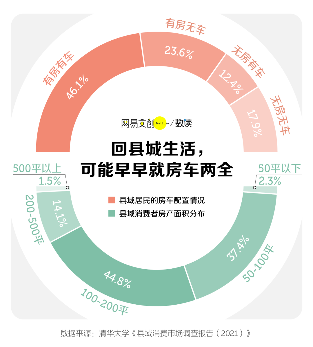 最重要的是,基于已有储蓄和家庭财力的支持,县城青年更有机会买房。根据清华大学《县域消费市场调查报告》,县域居民有房有车的比例高达 46.1%,而房产配置面积,大多都集中在 100 - 200 平。