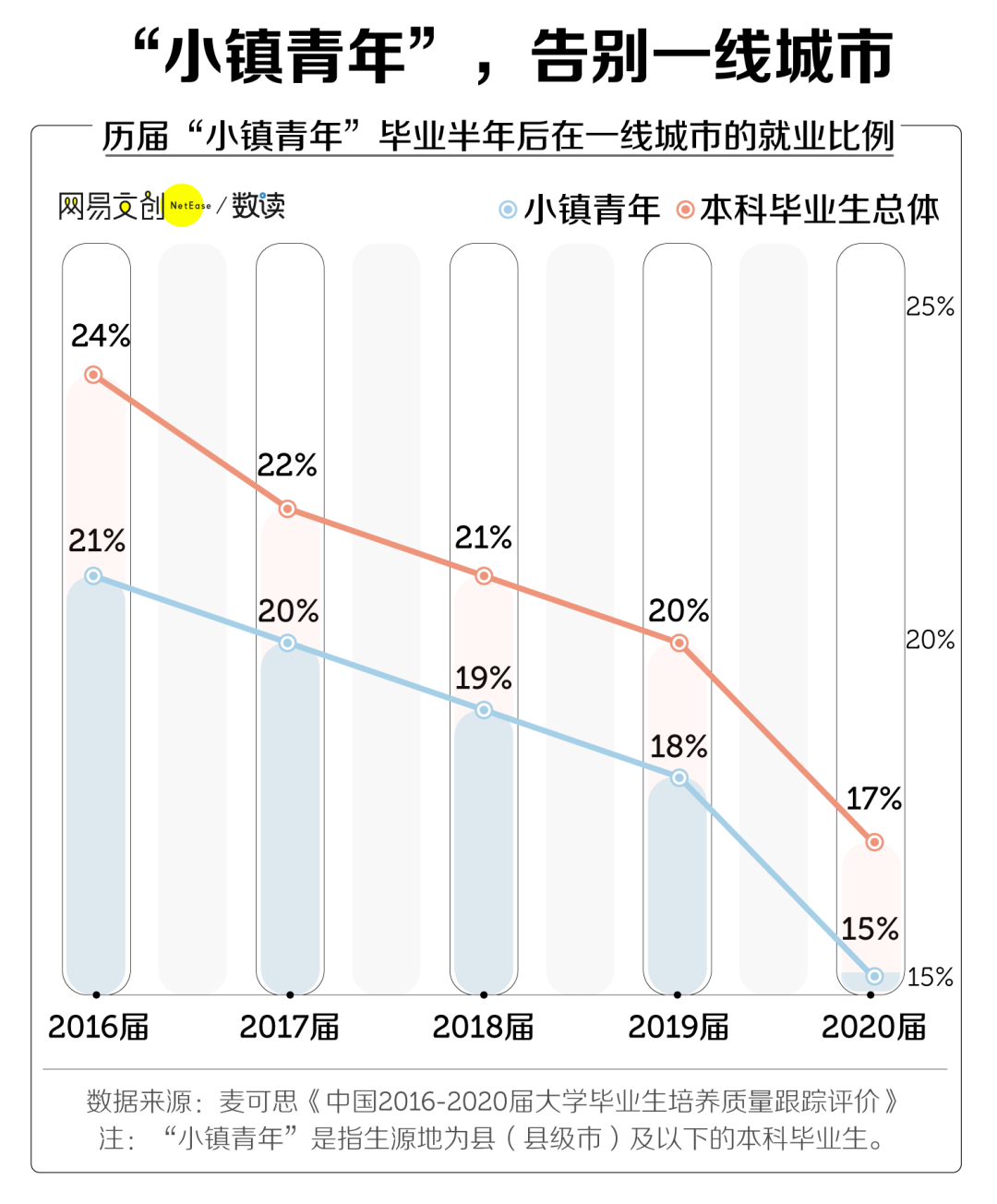 2016 届“小镇青年”毕业半年后在一线城市就业比例为 21%,到了 2020 届,这个数字仅为 15% 。