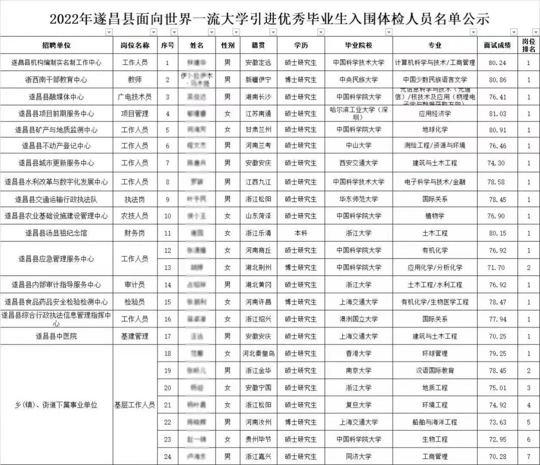 浙江省丽水市遂昌县最近发布的《2022 年遂昌县面向世界一流大学引进优秀毕业生入围体检人员公告》就显示:24 位入围基层岗位选拔的人员,均为名校学子。