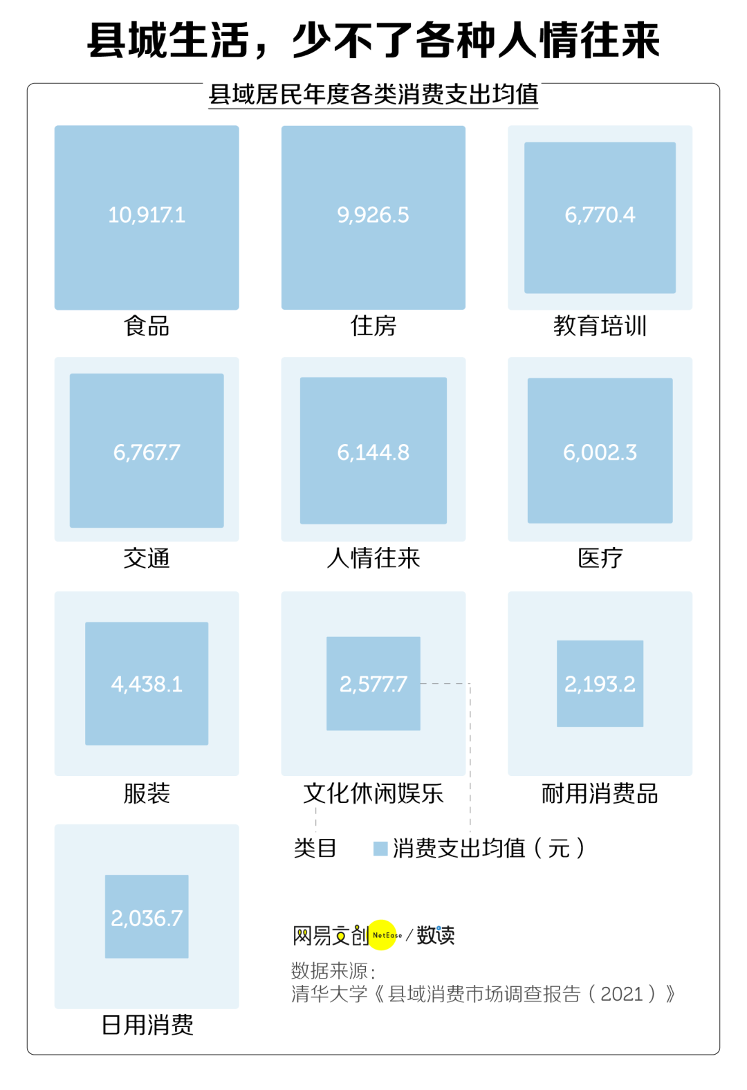 根据清华大学的县域消费数据,县城居民人情往来的一年平均支出会超过 6000 元,高于服饰、医疗、出行等支出,和在大城市生活的消费结构完全不同 [6]。
