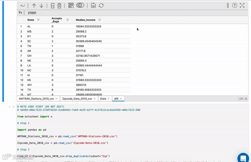 遵循以上相同的思路,Mito是一个Jupyter-Lab扩展和Python库,它使得在支持GUI的电子表格环境中操作数据变得超级容易。