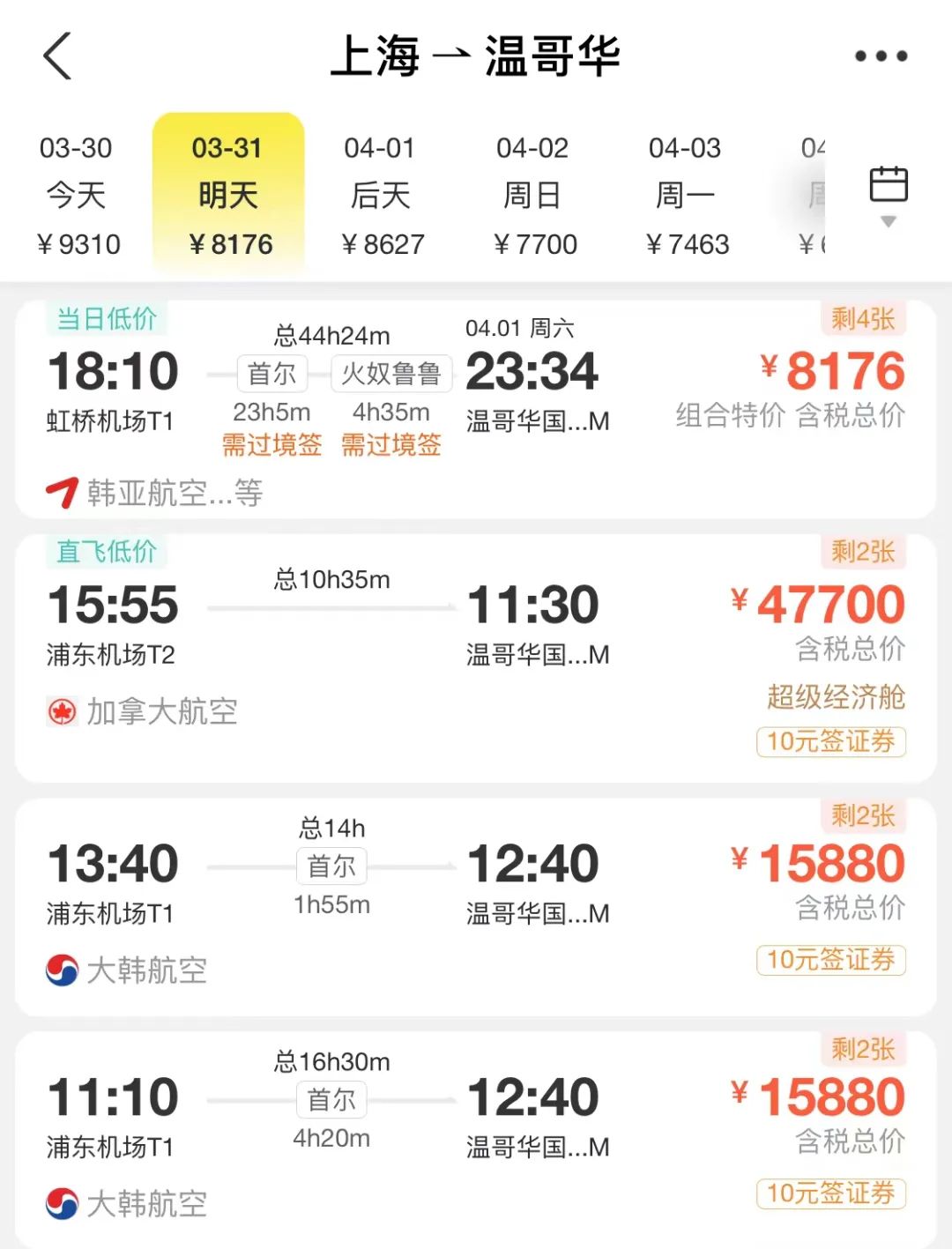 而从国内前往加拿大,上海直飞温哥华的超级经济舱的价格更是达到了47,700,这眼睁睁看着就要突破五万大关了!