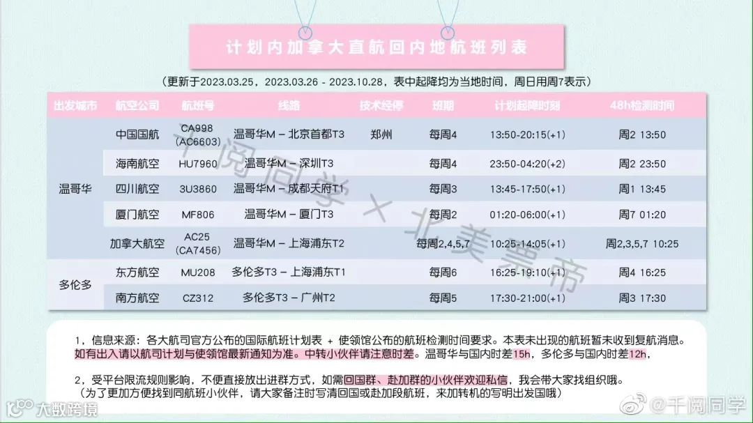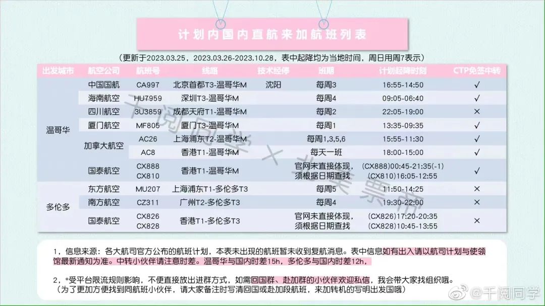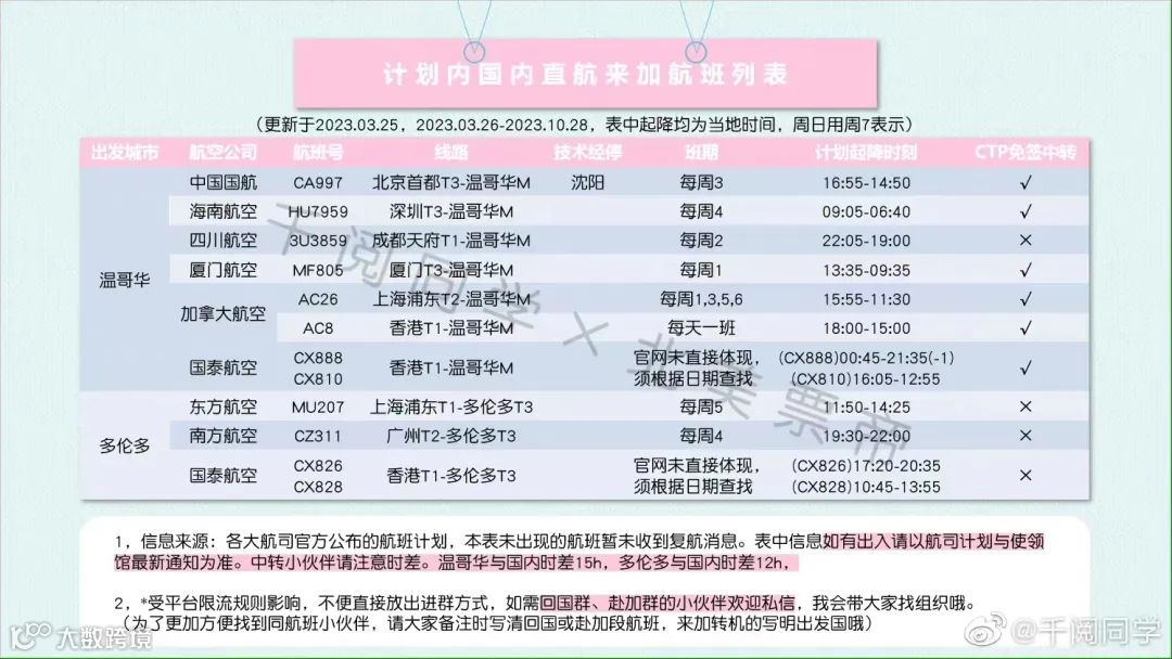 以下是微博博主@千阅同学整理的加拿大往返直航的一些具体航班信息,大家有需要的可以了解一下。