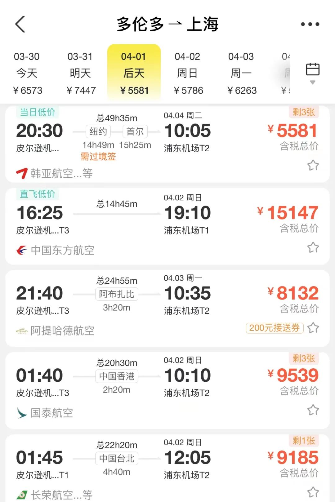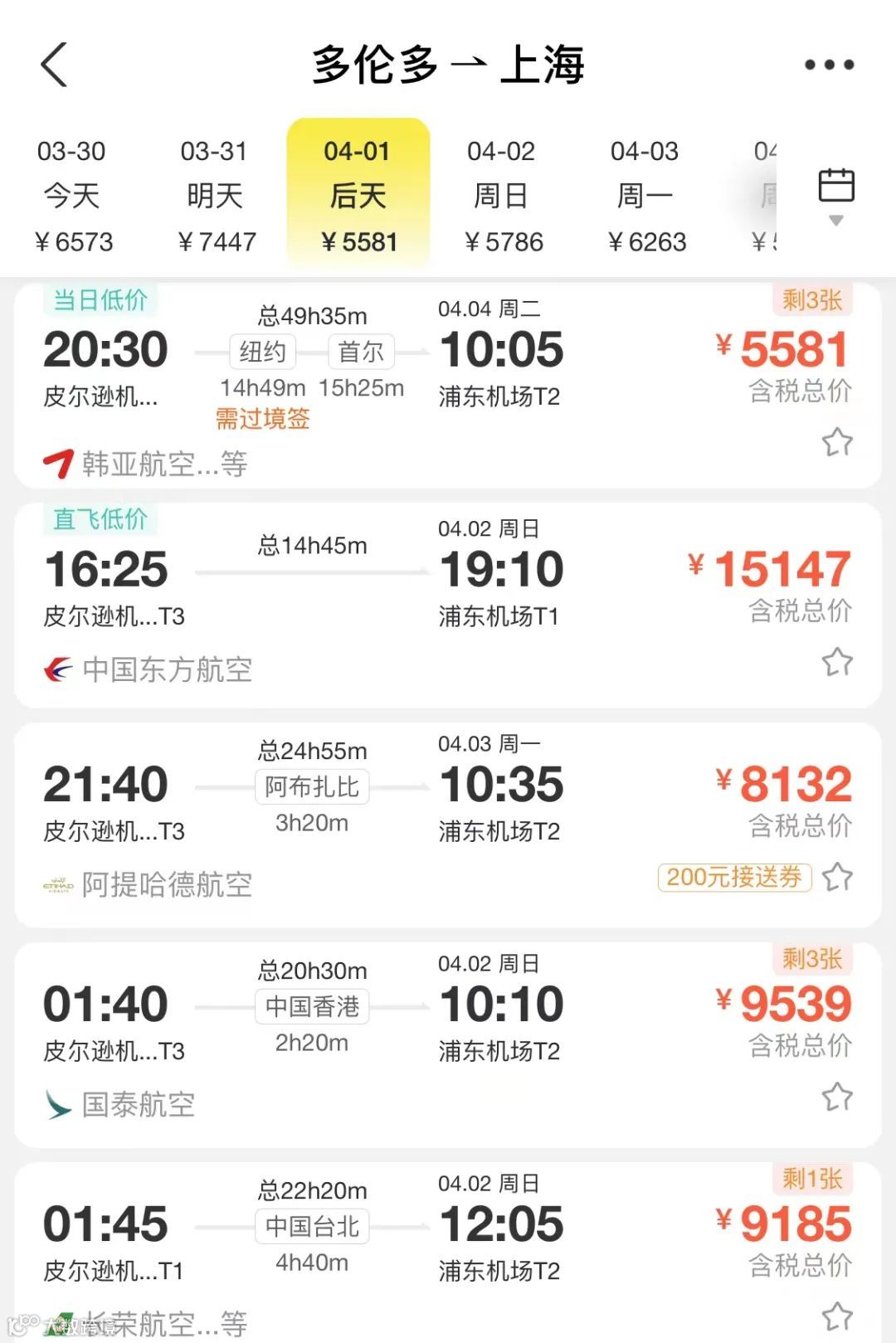 小编随手搜了下4月份多伦多前往上海的航班,票价就已经高达15,147,这回趟国可不得破产啊!