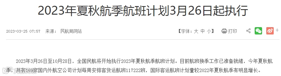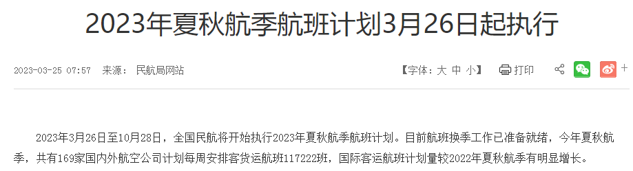 据悉目前航班换季工作已准备就绪,今年夏秋航季,共有169家国内外航空公司计划每周安排客货运航班117,222班,国际客运航班计划量较2022年夏秋航季有明显增长。