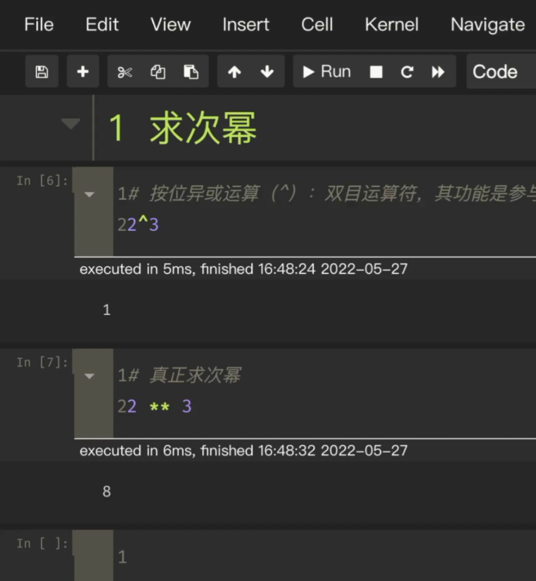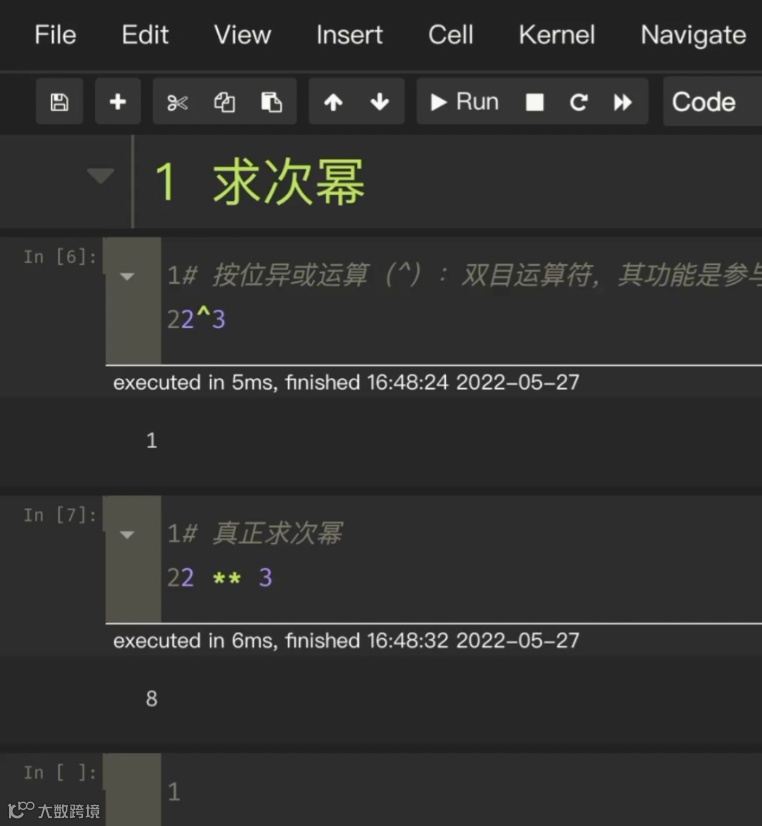次幂在 Python 里面怎么做,我们可能想到说是不是用 2^3 就可以求次幂,其实不是的。