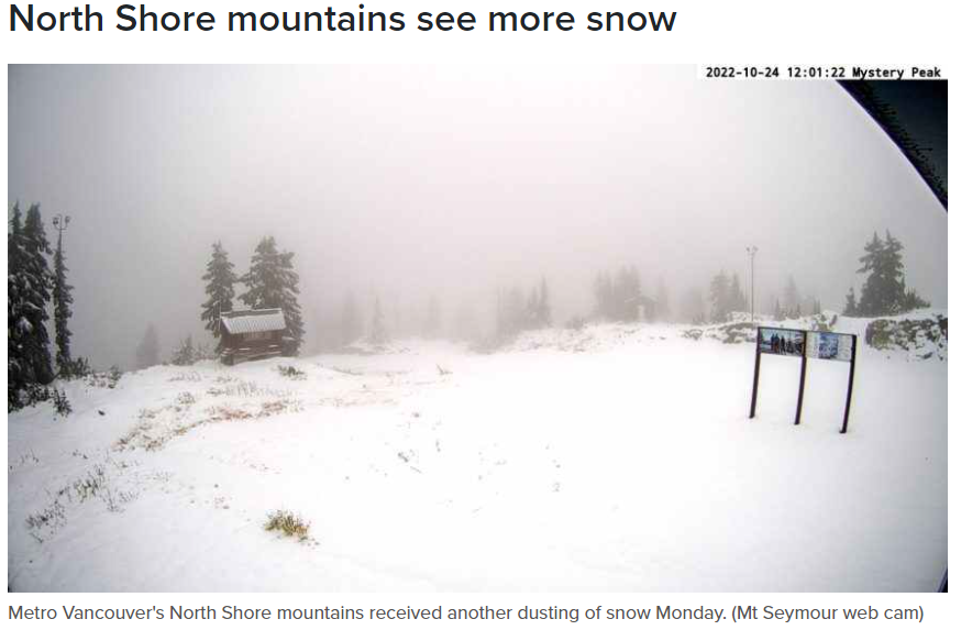 就在本周一,北部山脉再次飘雪,Mt Seymour,、Cypress Mountain 度假村、Grouse Mountain都披上了一层新雪。
