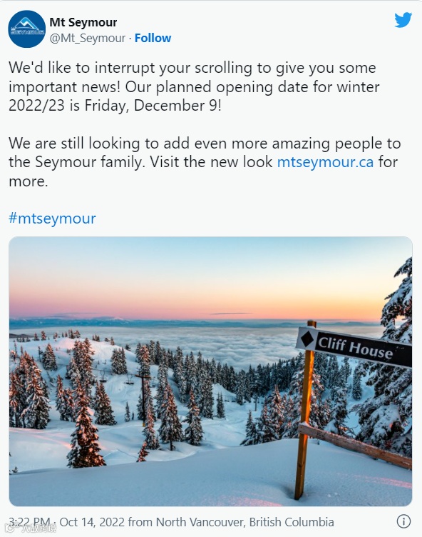 Seymour滑雪场正式宣布,2022年滑雪季将在12月9日开始,向游客开放!